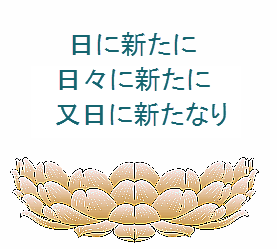 遠い昔の中国の聖人・商の国を治めていた湯(とう)王(おう)という方がいました。湯王は上の言葉を自分が毎日使用している洗面器に刻んだと言われています。この言葉は「湯王の盤の銘」として有名です。この言葉を基に湯王が国を治めていた十三年間は平和であったと言われています。 「今日の行いは、昨日よりも新しく良くなり、明日の行いは、今日よりも新しく良くなるように修養に心がけねばならない」というのです。